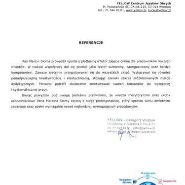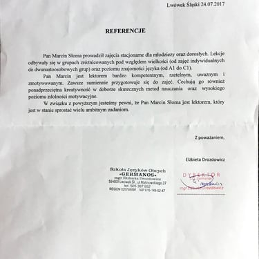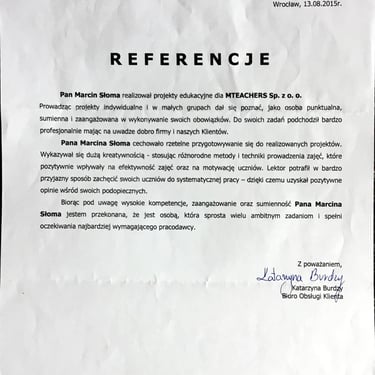 Ukończyłem studia magisterskie z filologii angielskiej na Uniwersytecie Wrocławskim. Mam 11 lat doświadczenia w prowadzeniu kursów języka angielskiego dla polskich firm, międzynarodowych korporacji, zajęć indywidualnych dla młodzieży oraz dorosłych, kursów maturalnych. Pracowałem też w szkołach językowych: Yellow, Germanos, ProfiLingua, Moose.